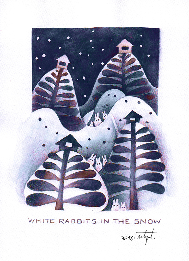 White Rabbits in the Snow Black & White. Watercolor and pencil. If you want to buy a print you can contact me. Digital illustration, 24x18cm, ...
